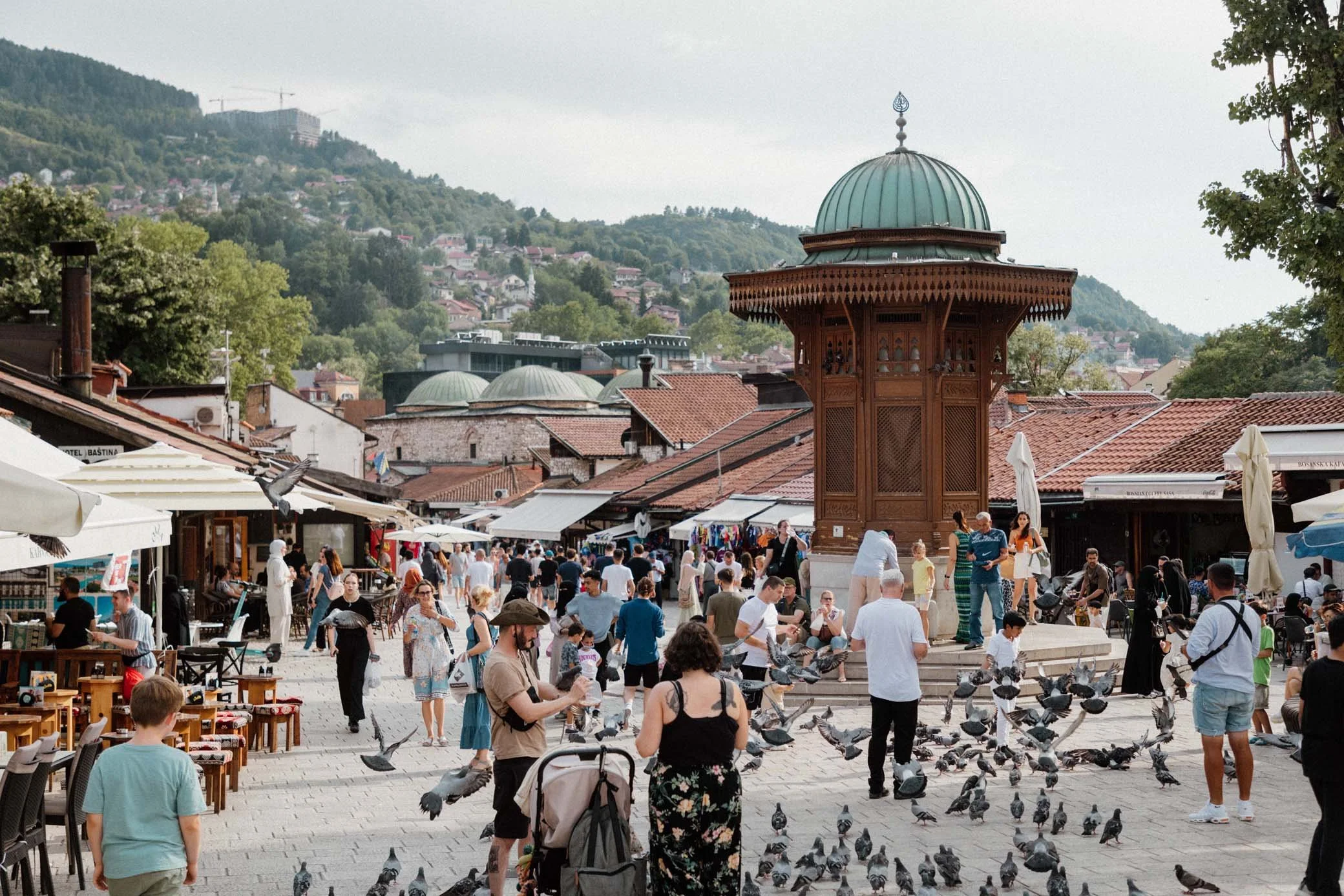 No centro está o Sebilj, fonte de madeira símbolo de Sarajevo, onde pombos se reúnem e turistas tiram fotos icônicas.
