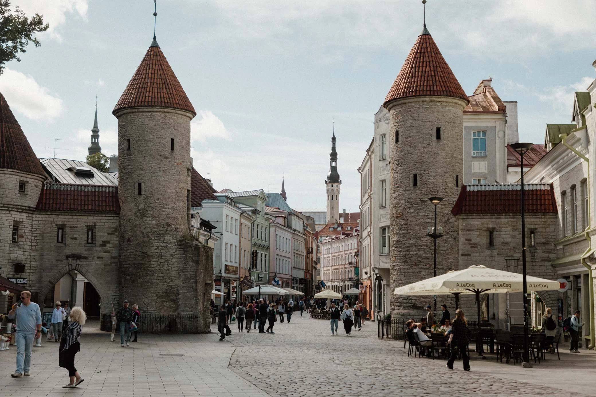 Viru Gate: Portão medieval icônico, hoje cercado por lojas, flores e cafés.