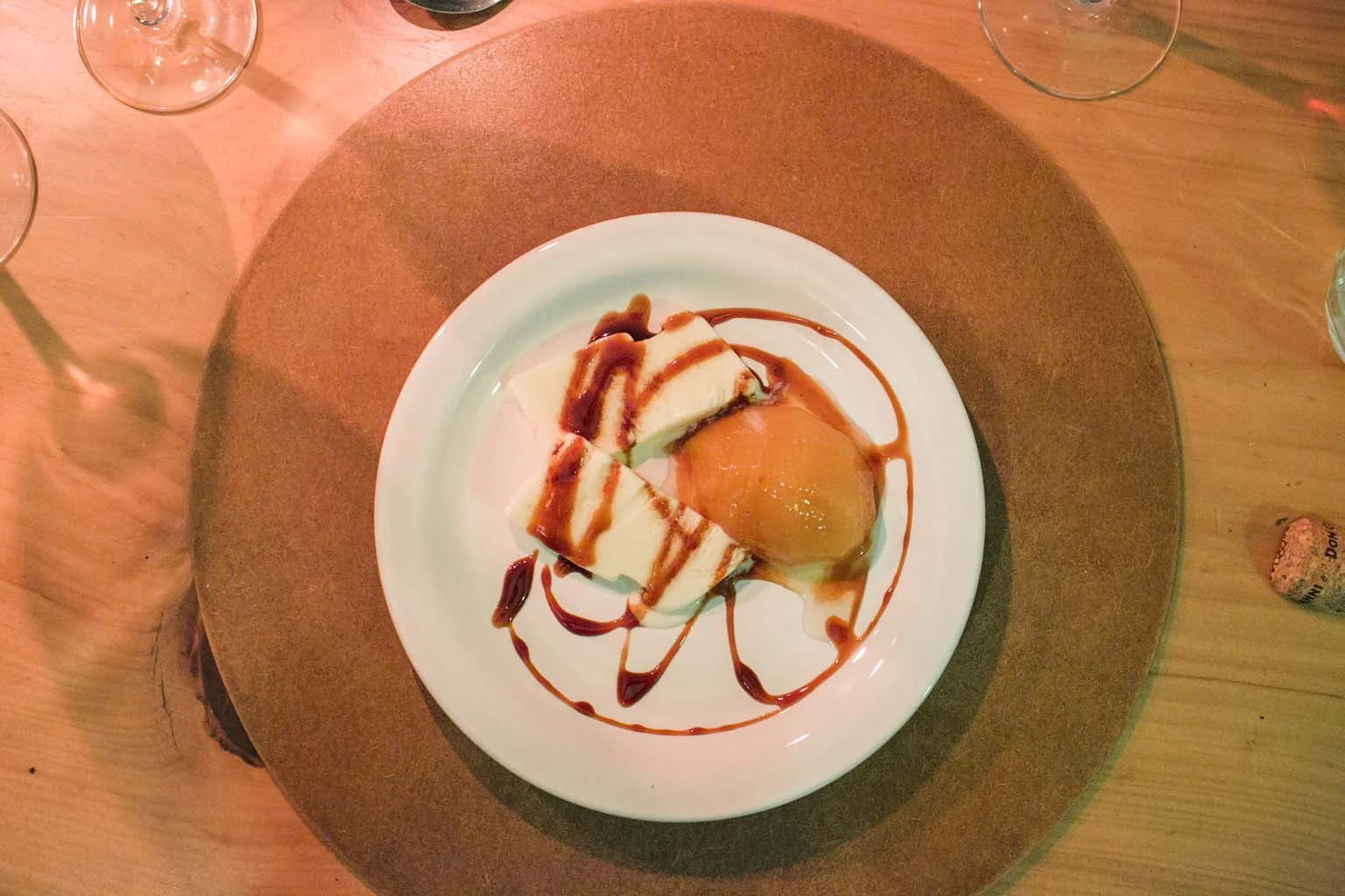 Nessa noite, provamos o risoto de alcachofra, que é produzida em frente aos galpões da vinícola, acompanhado de vinho branco Chardonay. De entrada, tivemos uma salada de alface com redução de vinho e manga flambada, acompanhada de espumante. Depois do risoto, veio um frango com cebola e batata assada com uvas passa acompanhado de vinho tinto Merlot. E de sobremesa, sorvete.
