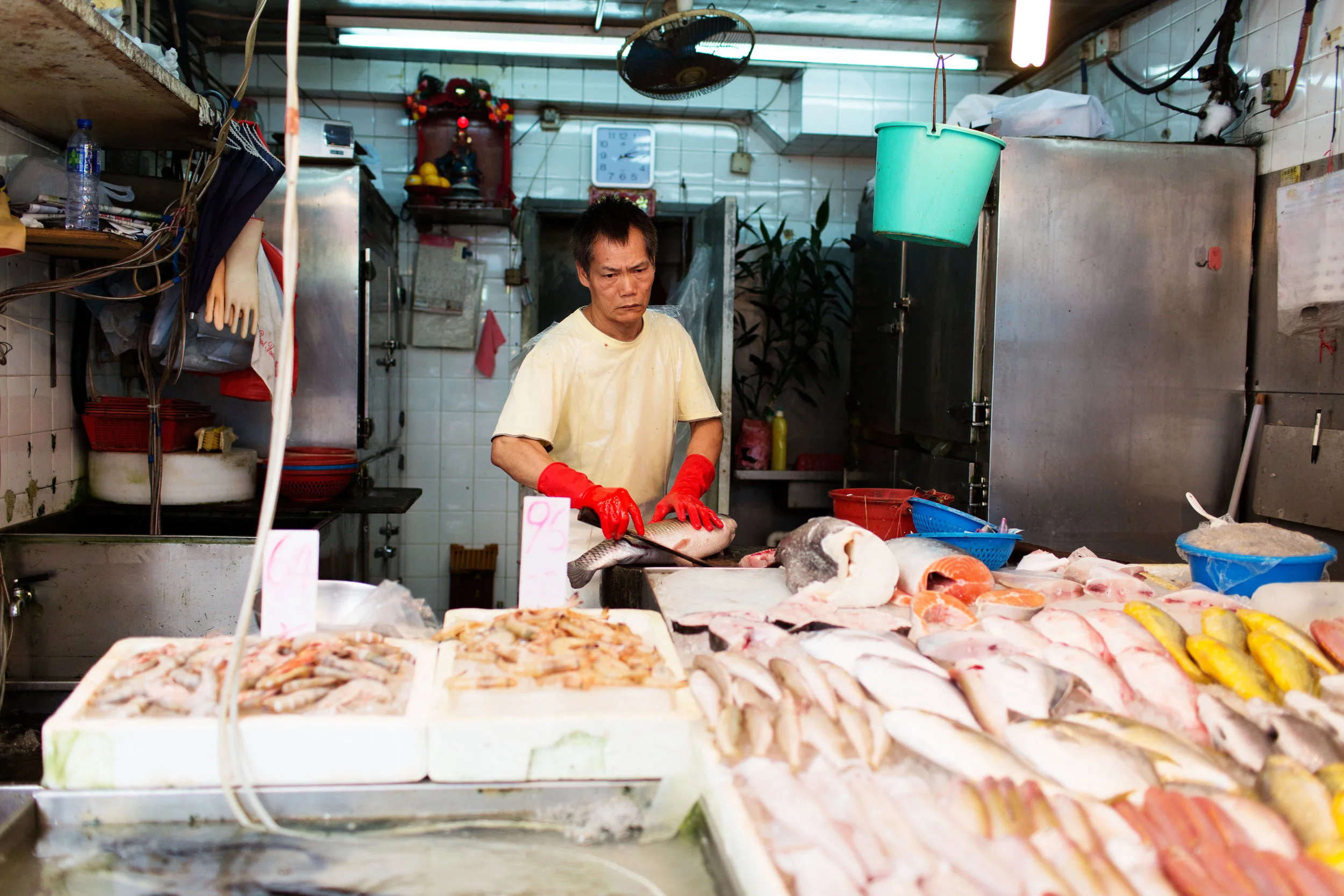 Mulher vendendo peixe na rua em uma cidade chinesa, sentada na escadaria ao lado de uma balança de mercado e caixas de peixe, com duas pessoas caminhando ao fundo.